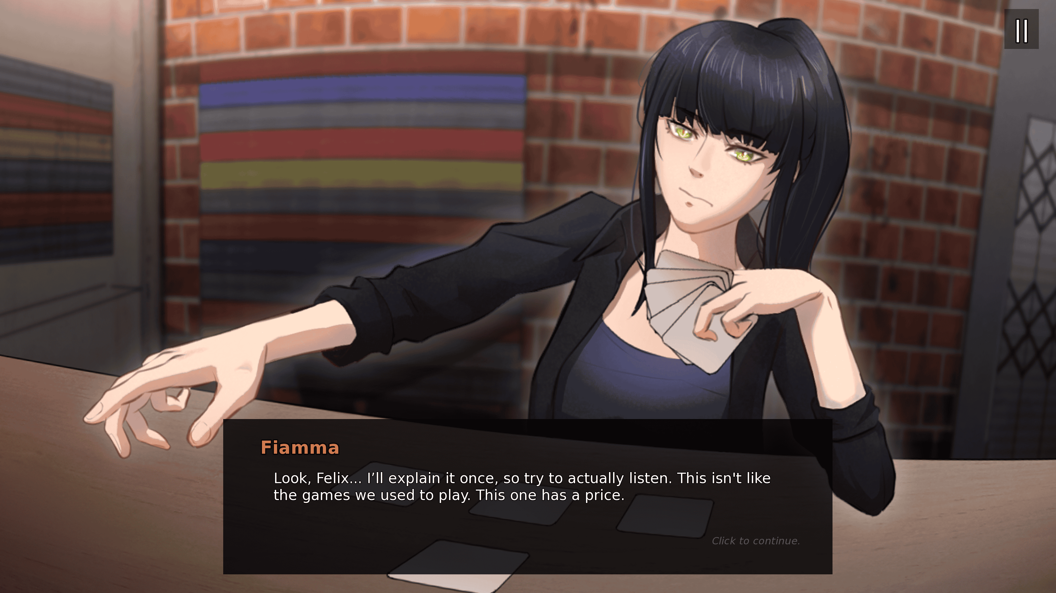 The player takes on the role of Felix Hare, the person his girlfriend, Fiamma Emerald is trying to leave and the entire card game becomes about what she avoids saying out loud.